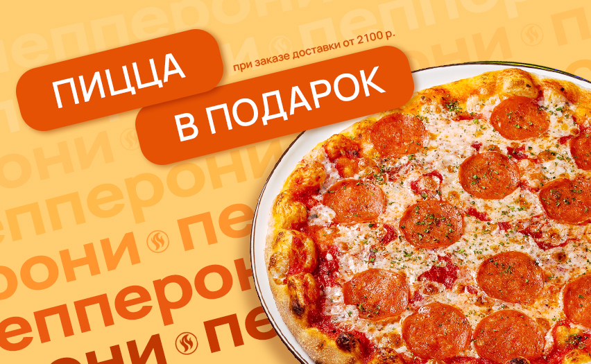 Итальянская щедрость в действии: к любому заказу от 2100 рублей мы дарим горячую, ароматную пиццу «Пепперони» абсолютно бесплатно.